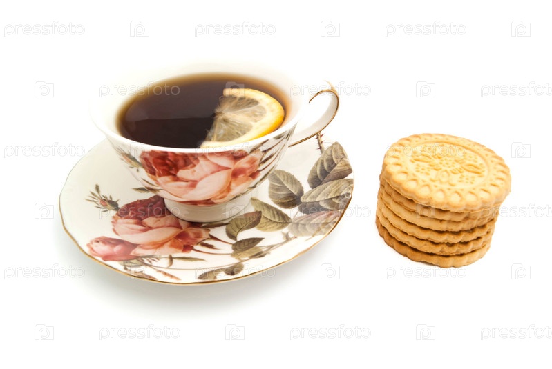 Чашка чая с лимоном и вкусные печенья