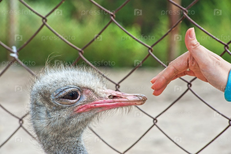 Страус смотрит на женскую руку