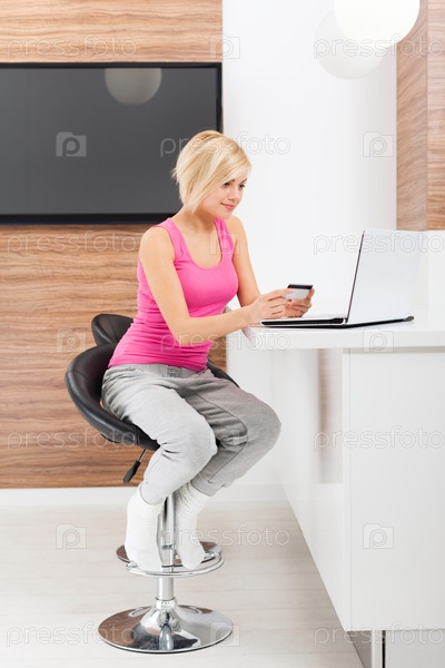 Женщина, с кредитной картой и ноутбуком