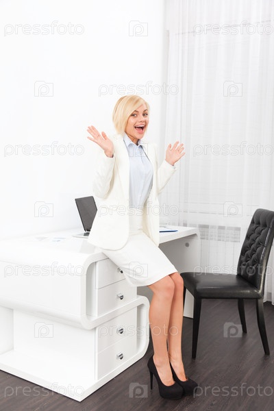 Деловая женщина сидя на столе