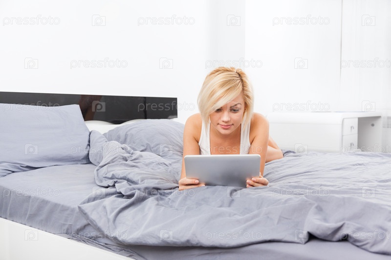 Красивая женщина, лежа на кровати, с помощью цифрового планшета