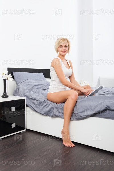Женщина, сидя на кровати, с помощью цифрового планшета