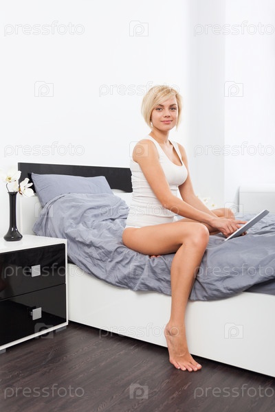 Женщина, сидя на кровати, с помощью цифрового планшета