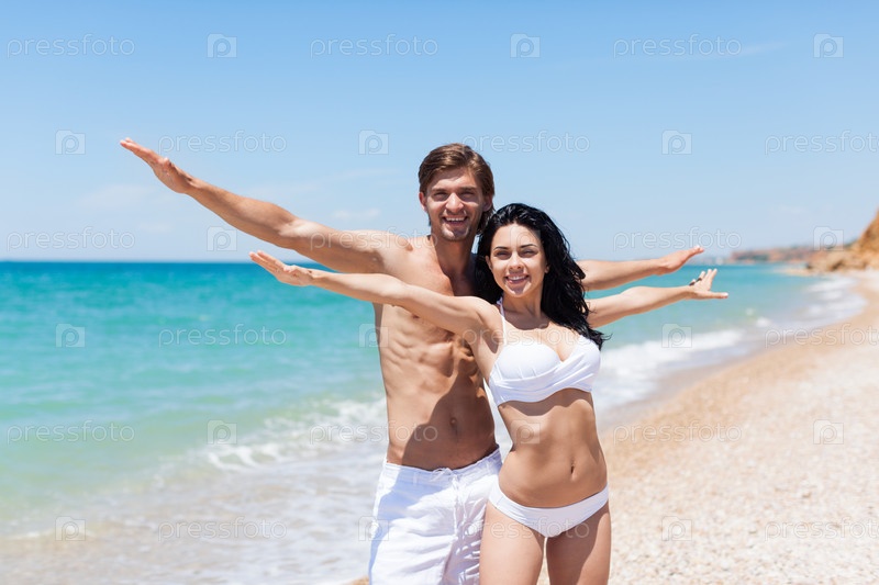 Счастливая пара на пляже держать протягивая руки