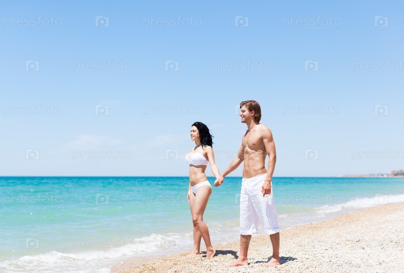 Пара, ходить на пляж, любовь держаться за руки