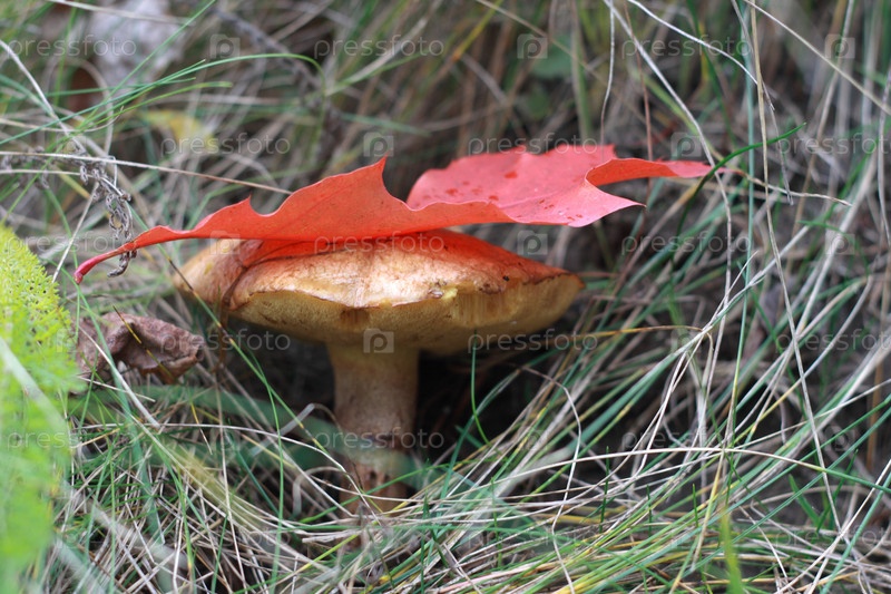 Гриб в траве с листиком