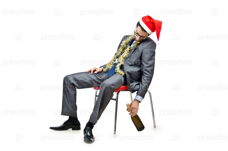 Молодой бизнесмен в новогодней шапке с бутылкой шампанского