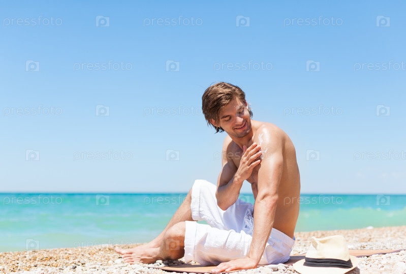 Человек применить солнцезащитный лосьон для тела