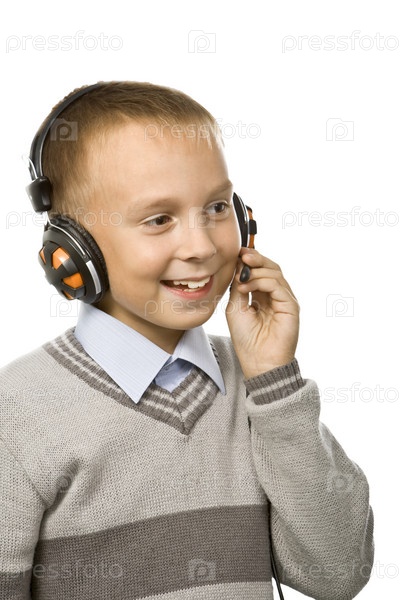 Мальчик говорит по минигарнитуре на белом фоне