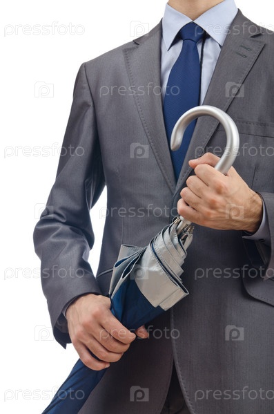 Бизнесмен с зонтом на белом фоне