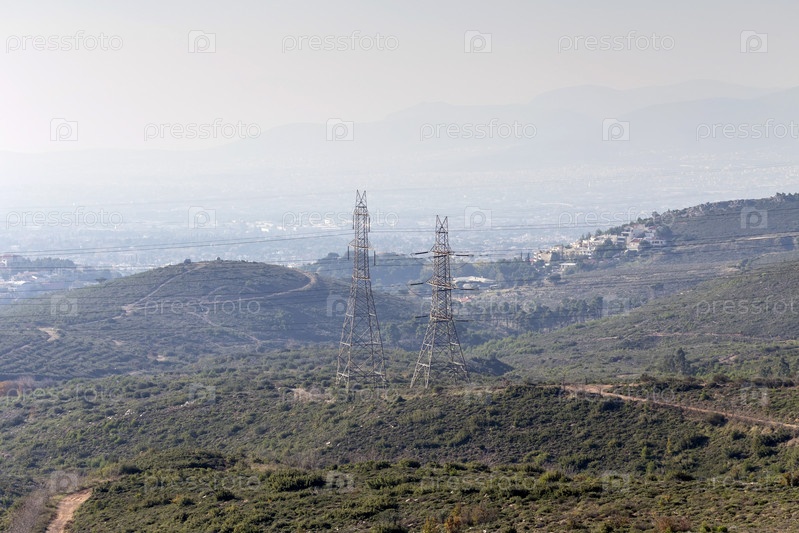 Колонны и провода электропередач в горной местности