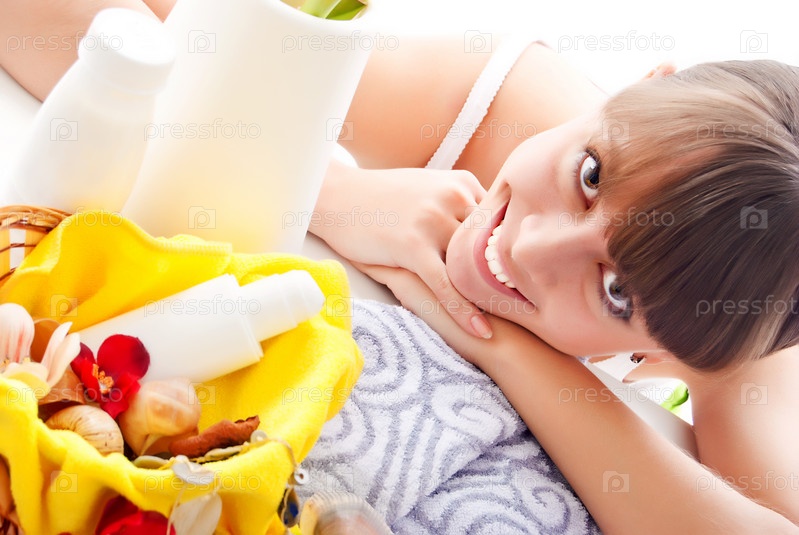 Молодая красивая женщина на массажном столе в спа салоне