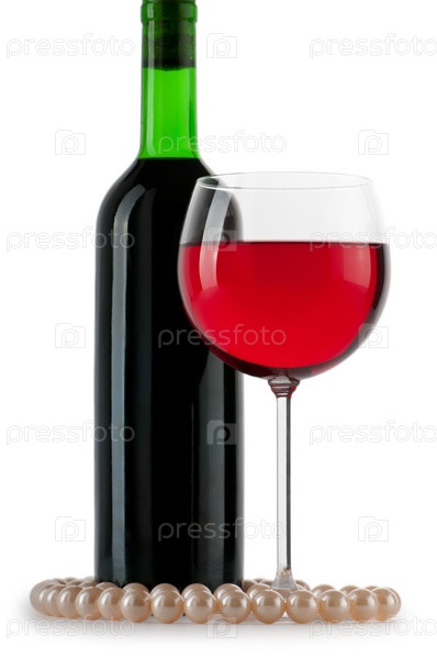 Вино и жемчужное ожерелье на белом фоне