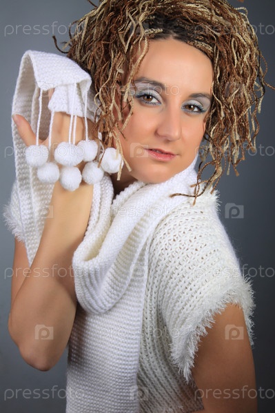 Портрет девушки с шарфом на сером фоне