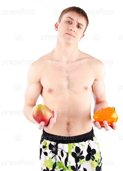 Человек, держит манго и оранжевый перец