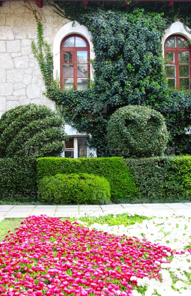 Стена дома с зеленым Плющом и клумбой с яркими цветами