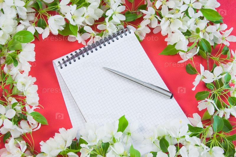 Фон с ветками цветущей яблони и блокнотом