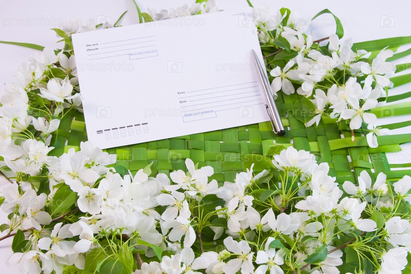Фон с ветками цветущей яблони, конверт и ручка
