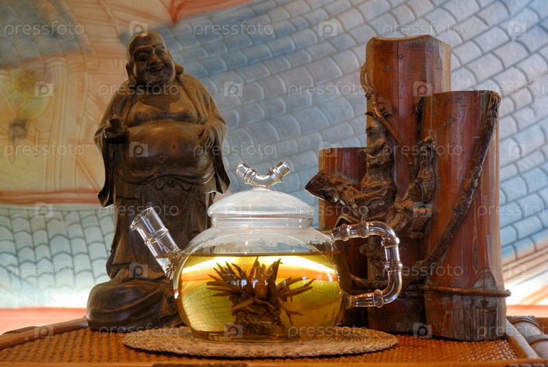 Чай в стеклянном чайнике рядом с восточными статуэтками
