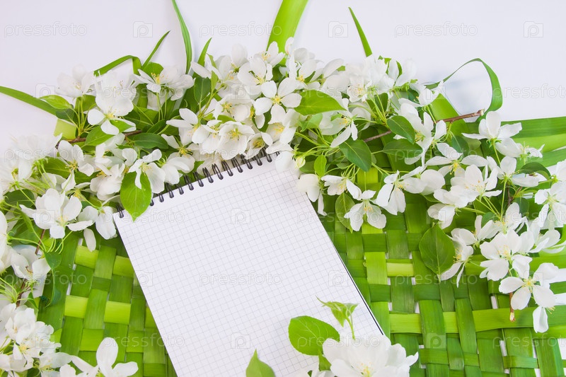 Фон с ветками цветущей яблони, блокнот