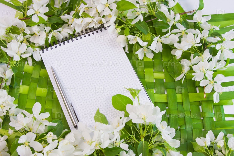 Фон с ветками цветущей яблони, блокнот