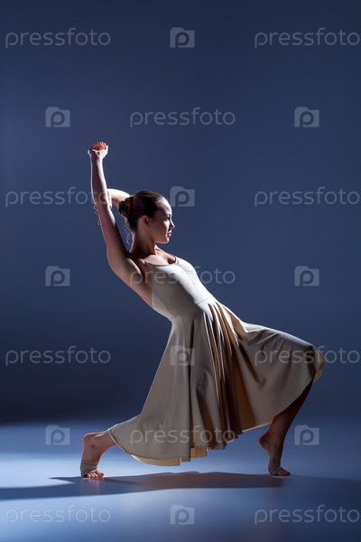 Молодая красивая танцовщица в Бежевое платье, танцы на сером фоне