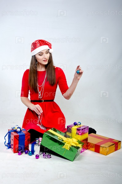 Девушка в новогодней шапочке с подарками