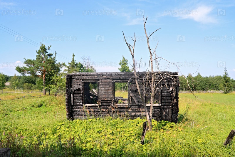 Сгоревший дом на зеленом лугу