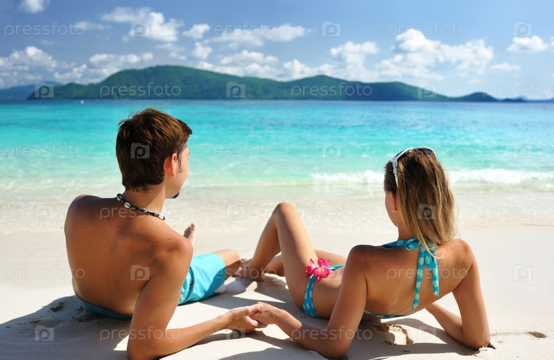 Влюбленная пара загорает на пляже