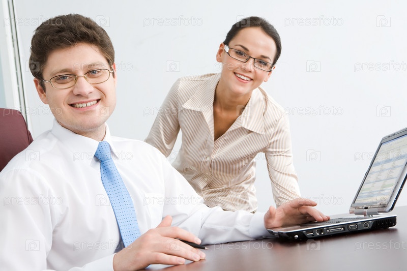 Фото улыбающегося босса, смотрящего в камеру с женщиной на заднем плане