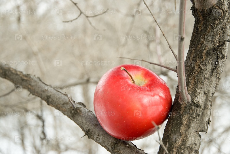 Яблоко между ветками дерева зимой