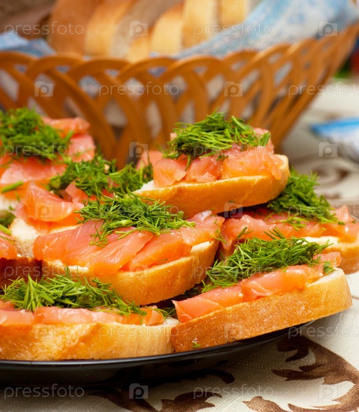 Куча бутербродов с красной рыбой и зеленой петрушкой