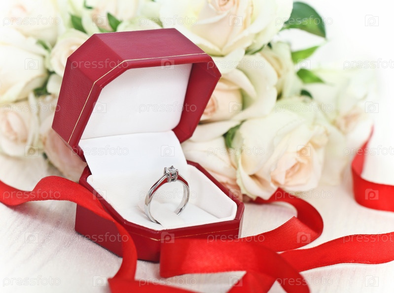 Предложение брака. Обручальное кольцо с бриллиантами и розы