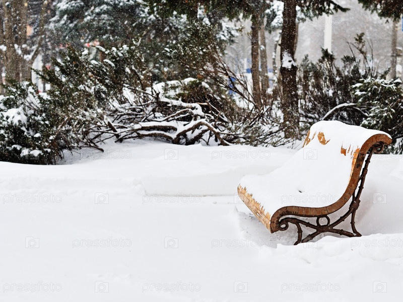 Скамейка под снегом в парке