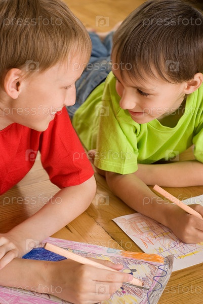 Братья, лежат на полу и рисуют