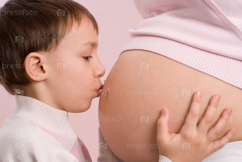 Беременная женщина и ее сын на розовом фоне