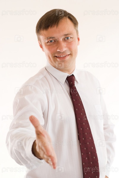Улыбающийся бизнесмен протягивает руку для приветствия