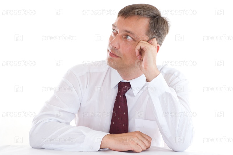 Озадаченный бизнесмен на белом фоне