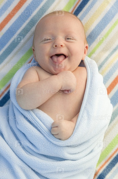 Смех мальчика, завернутые в его одеяло