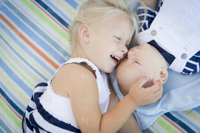 Сестренка, укладка рядом с ее ребенок брата на одеяло