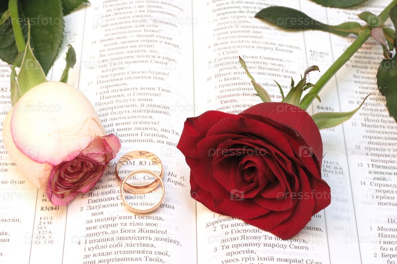 Две красные розы и обручальные кольца на Библии