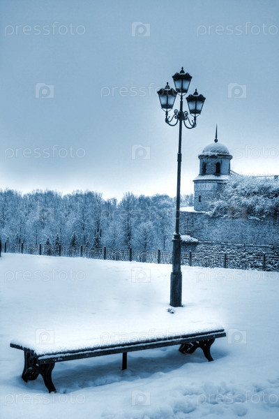 Зимний парк. Башня средневекового замка. Дубно. Украина
