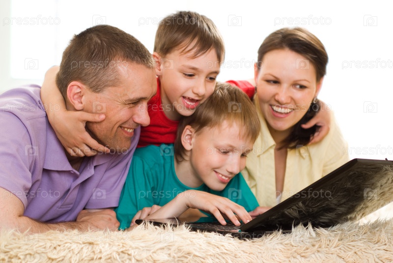 Портрет счастливой семьи из четырех человек с ноутбуком