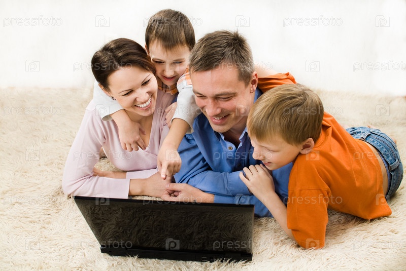 Портрет счастливой семьи из четырех человек с ноутбуком