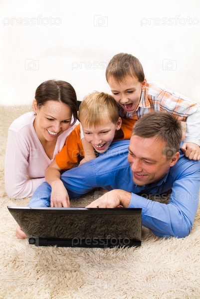 Портрет счастливой семьи из четырех человек с ноутбуком