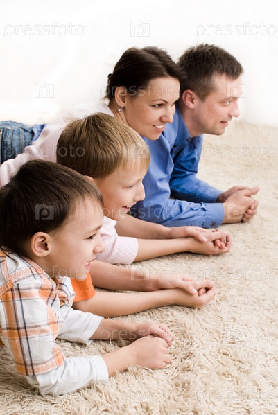 Счастливая семья из четырех человек, лежащих на ковре