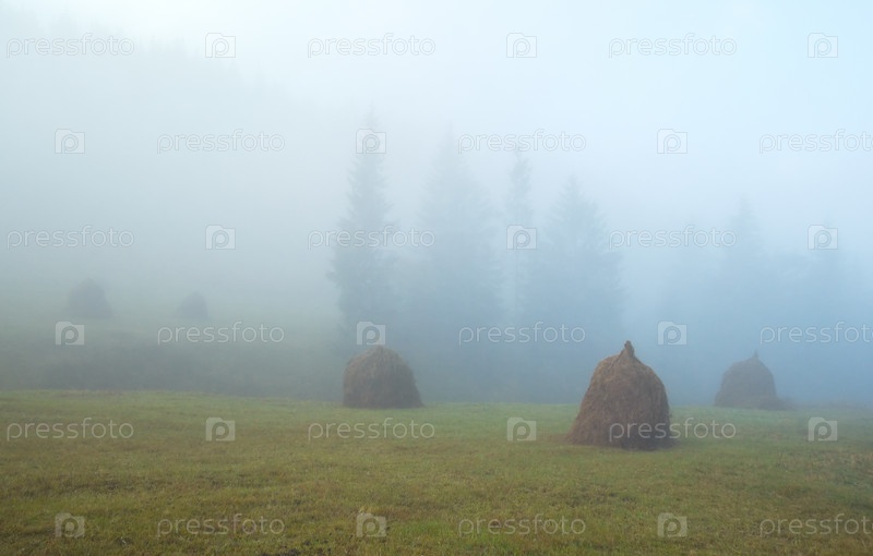 Стога на склоне туманным утром (Карпаты, Украина)