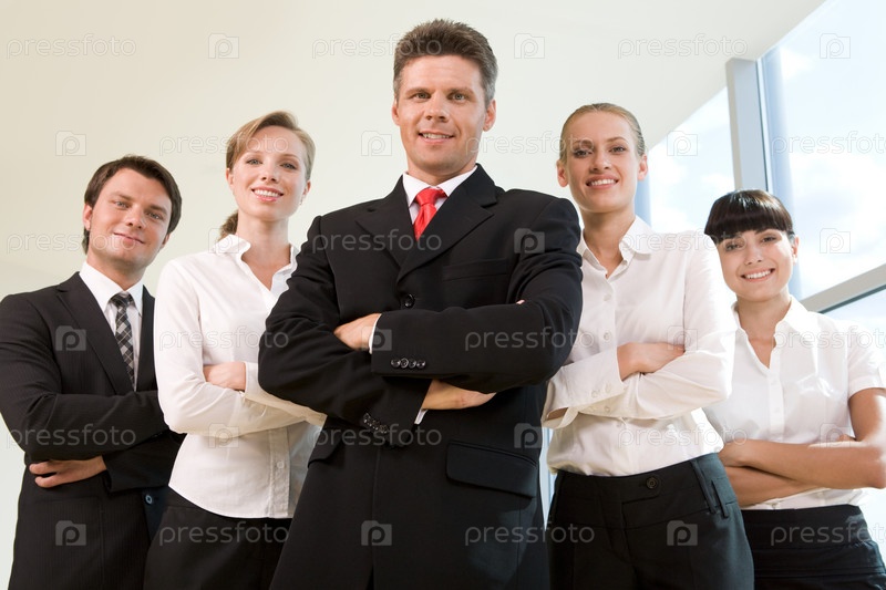 Несколько деловых партнеров смотрят на камеру с успешным мужчиной перед собой