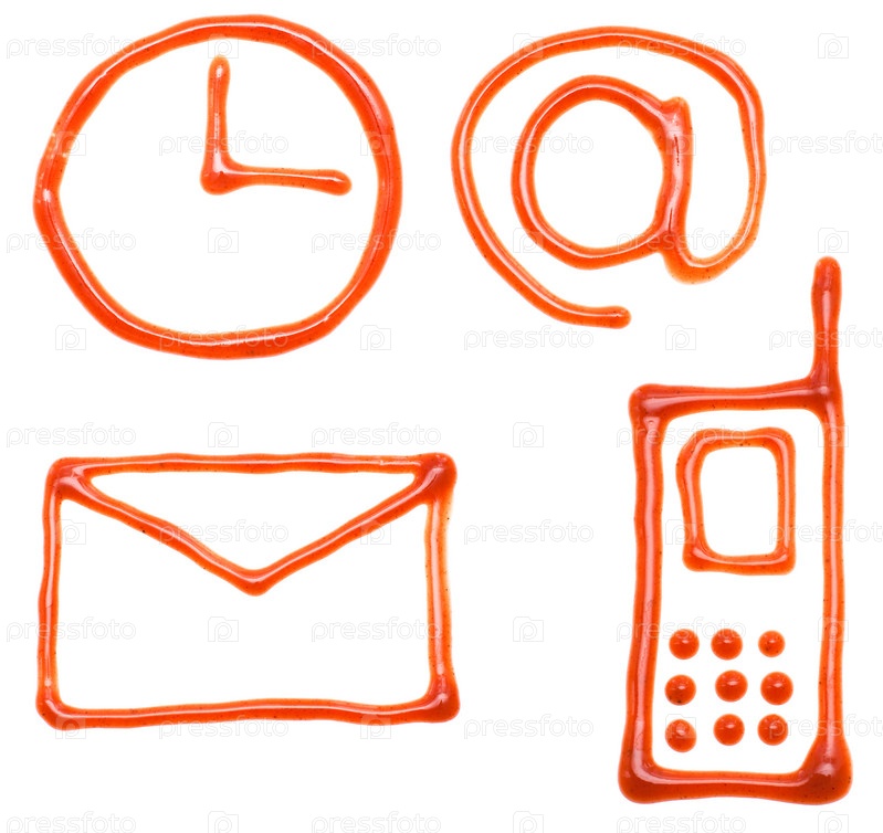Иконки часов кетчупа, 'на', конверта, телефона изолированы на белом фоне