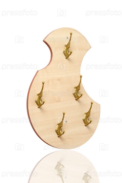 Деревянная вешалка с металлическими крючками на белом фоне